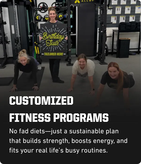 Unlike crowded classes or impersonal gyms, Alloy offers expert-led small group personal training in a welcoming, age-appropriate environment. You’ll get individualized attention, accountability, and real results—without feeling like you’re on your own.